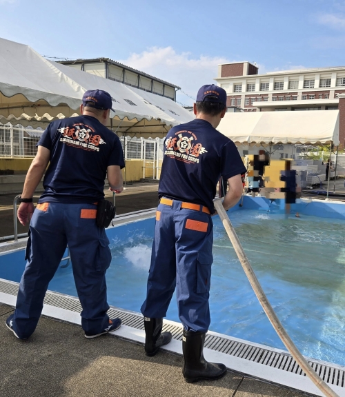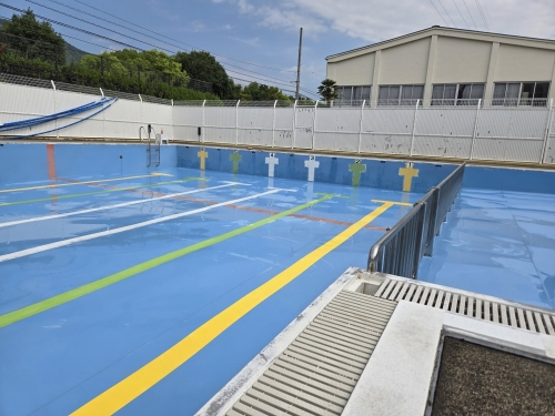 また、安佐南消防団祇園分団の協力により、プール清掃も実施されました。高圧の放水でプールの苔や水垢などを洗い流し、教職員の皆様がデッキブラシ等で磨き上げました。