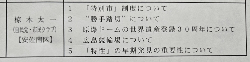 発言項目は5つ。①「特別市」制度②”勝手踏切”③原爆ドームの世界遺産登録30周年④広島競輪場⑤「特性」の早期発見の重要性ーーです。