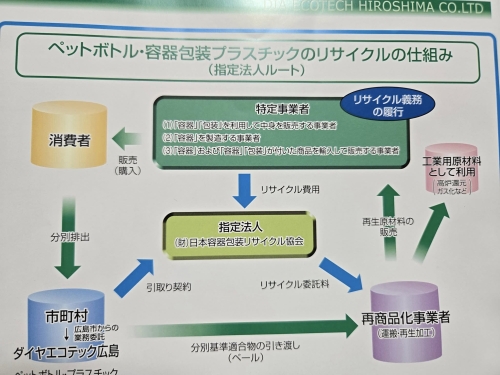 まず、「ダ社」は広島市全域で収集されたペットボトルと容器包装プラスチックを選別、圧縮、梱包し、再商品化事業者に引き渡すといった業務を担っています。