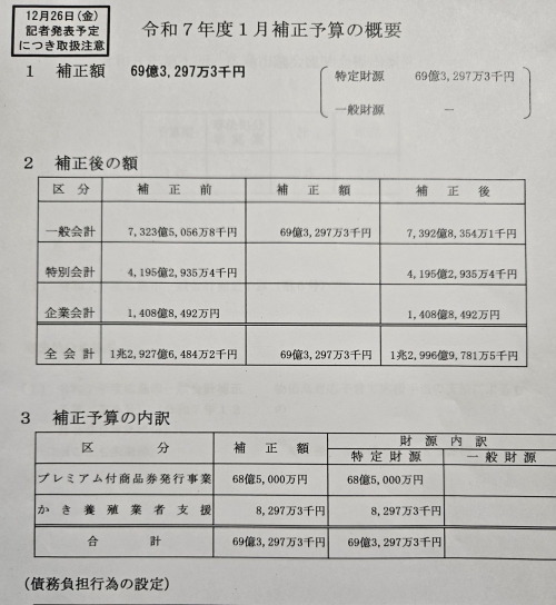物価高対策としての「プレミアム付商品券発行事業」(68億5000万円)など計69億3297万円を追加する一般会計補正予算案を含む2議案が提出されます。