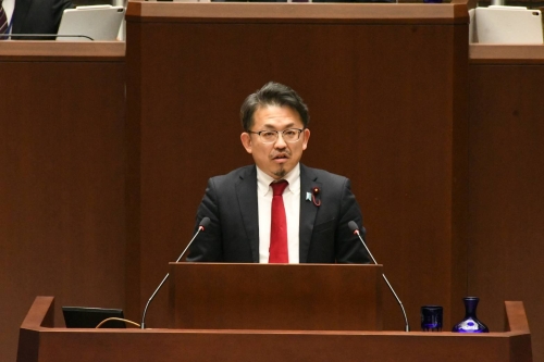 2月定例会の総括質問で登壇したむくぎ太一