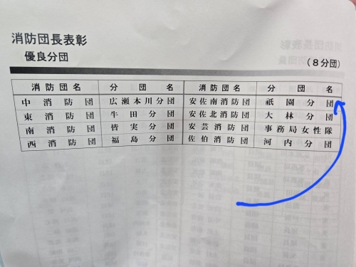 また、私が所属する安佐南消防団祇園分団が優良分団として表彰されました。