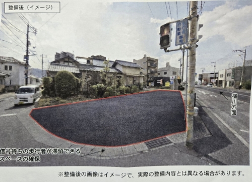 今年度、用地取得と並行し、「西原一丁目交差点」に「歩行者滞留スペース」を暫定的に整備します。