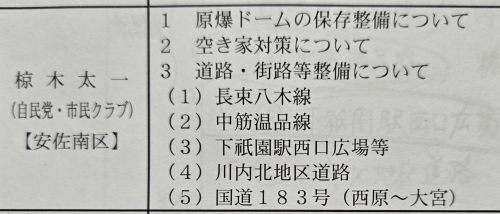 私の発言項目は、①原爆ドームの保存工事②空き家対策③道路・街路等の整備ーーの3つでした。
