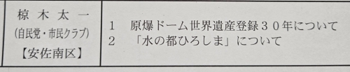 私の発言項目は、①原爆ドーム世界遺産登録30周年②「水の都ひろしま」ーーの2つでした。